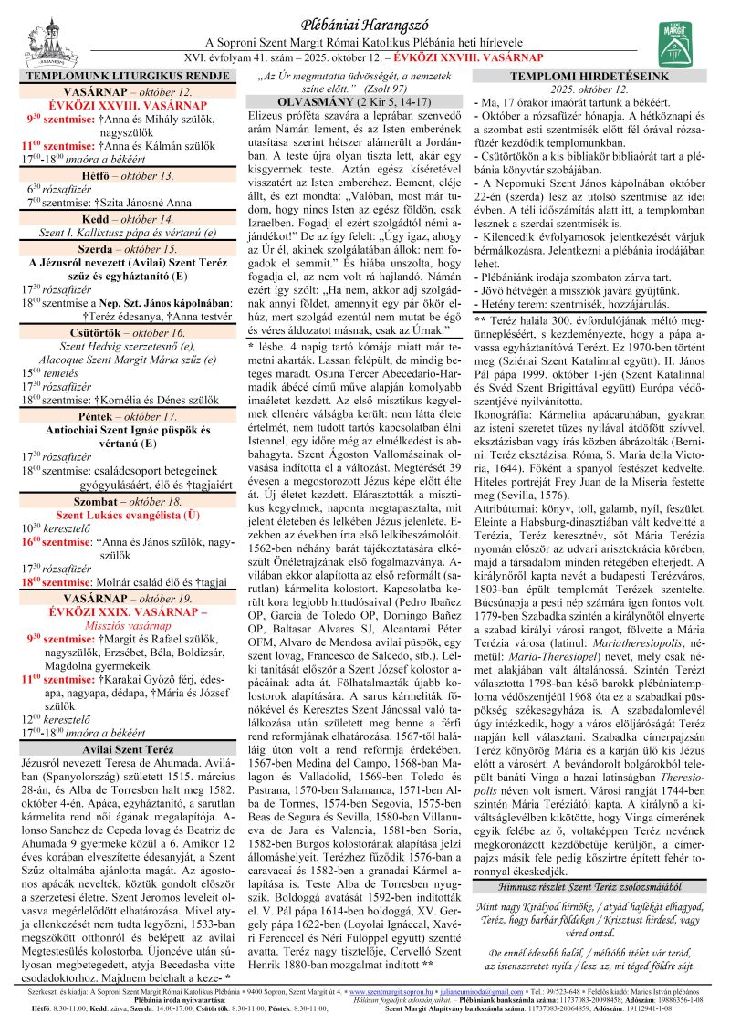 Elsőpéntek lesz, az időseket és betegeket felkeresem otthonukban. Csütörtökön és pénteken, 17 órától szentgyónási lehetőség lesz. A péntek esti szentmise előtt, 17 órától imaóra lesz a Rózsafüzér Társulat vezetésével.