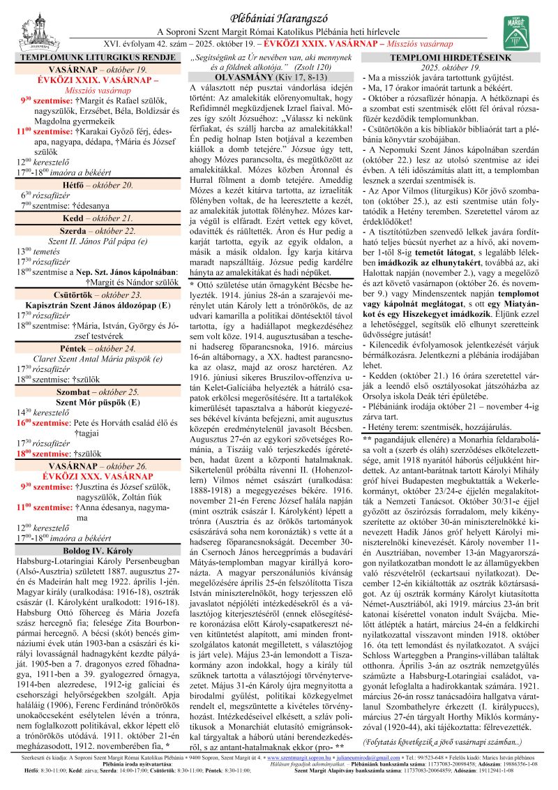Elsőpéntek lesz, az időseket és betegeket felkeresem otthonukban. Csütörtökön és pénteken, 17 órától szentgyónási lehetőség lesz. A péntek esti szentmise előtt, 17 órától imaóra lesz a Rózsafüzér Társulat vezetésével.
