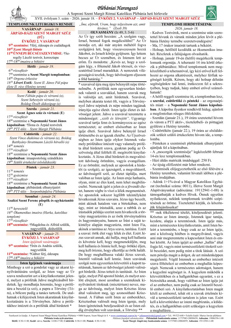 A hétfő reggeli szentmise itt, a templomban lesz, a szerdai, csütörtöki és pénteki (2026.01.21-23.) – az orgonaépítés miatt – a Nepomuki Szent János kápolnában.