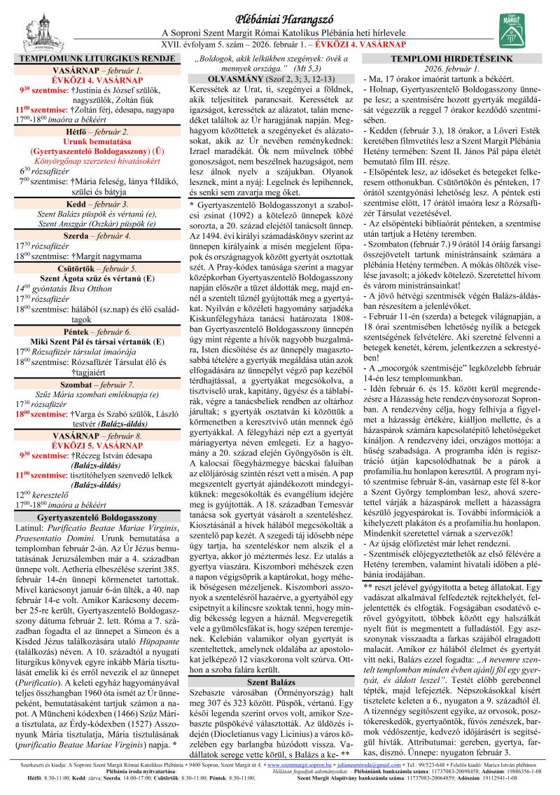 Holnap (február 2.), Gyertyaszentelő Boldogasszony ünnepe lesz; a szentmisére hozott gyertyák megáldását végezzük a reggel 7 órakor kezdődő szentmisében.