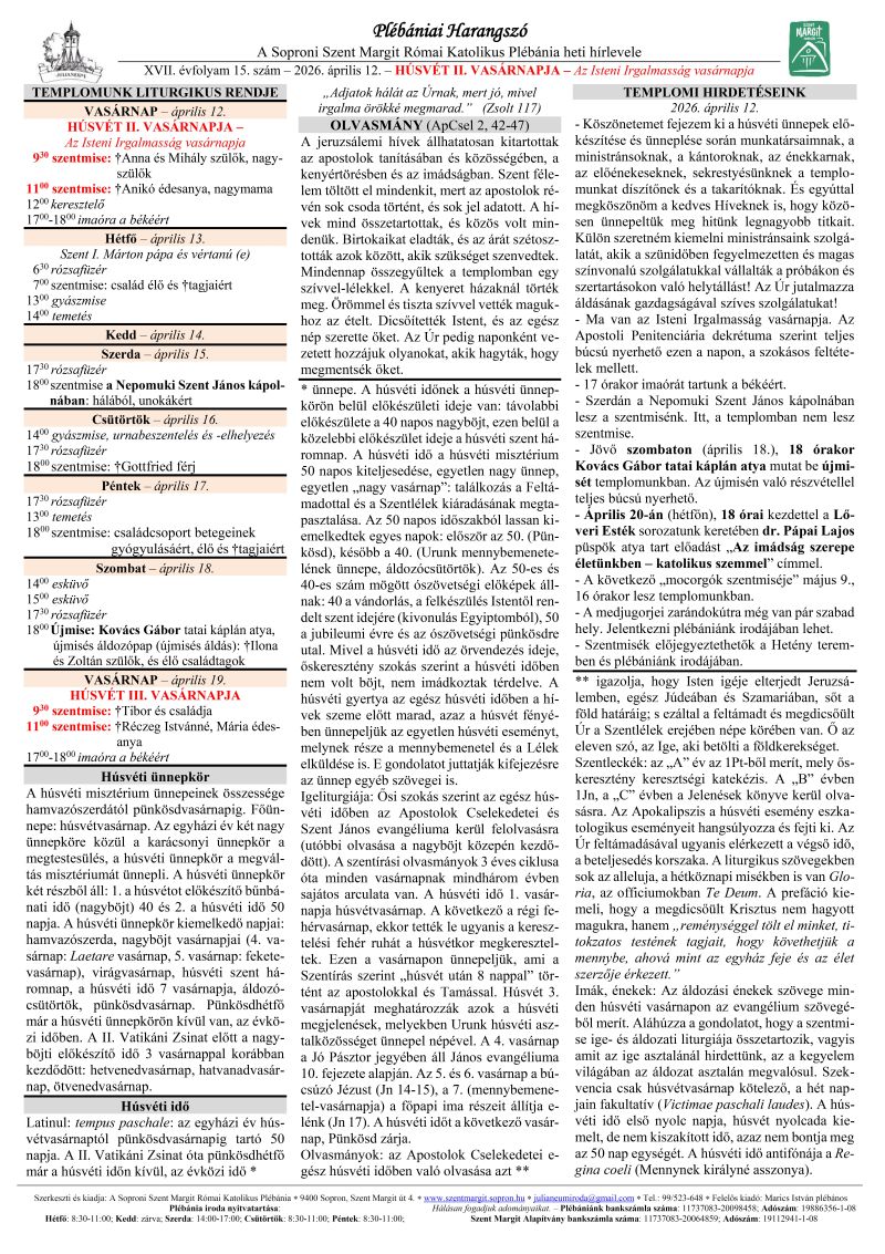 Jövő szombaton (április 18.), 18 órakor Kovács Gábor tatai káplán atya mutat be újmisét templomunkban. Az újmisén való részvétellel teljes búcsú nyerhető.