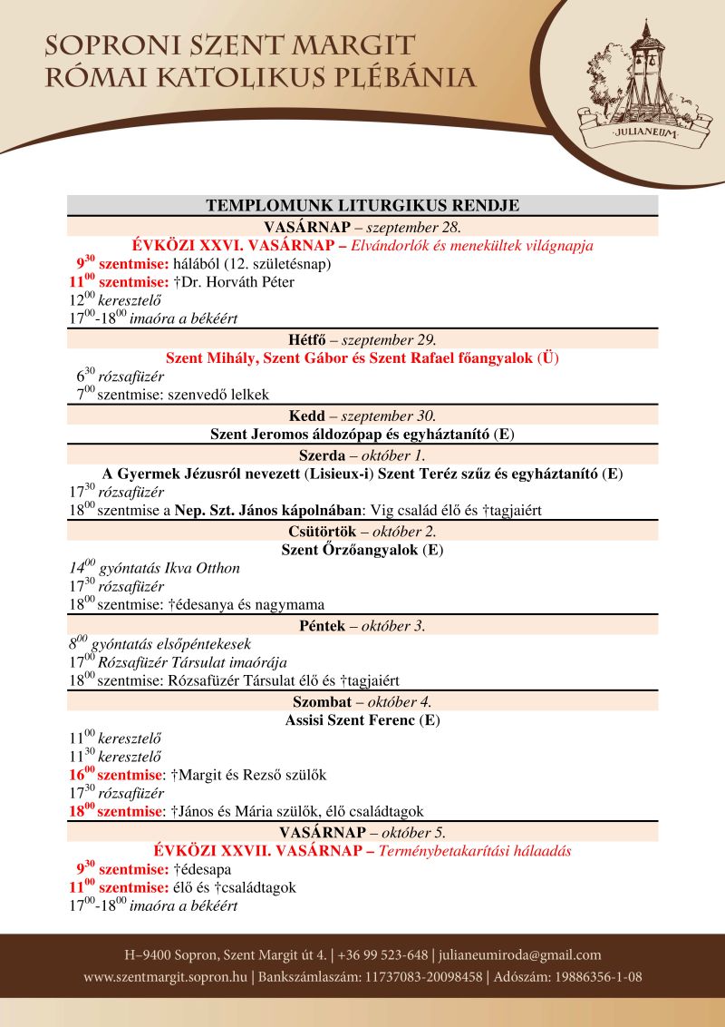 Október a rózsafüzér hónapja. A hétköznapi és a szombat esti szentmisék előtt fél órával kezdődik templomunkban a rózsafüzér. Kapcsolódjunk bele minél többen a közös imádságba!