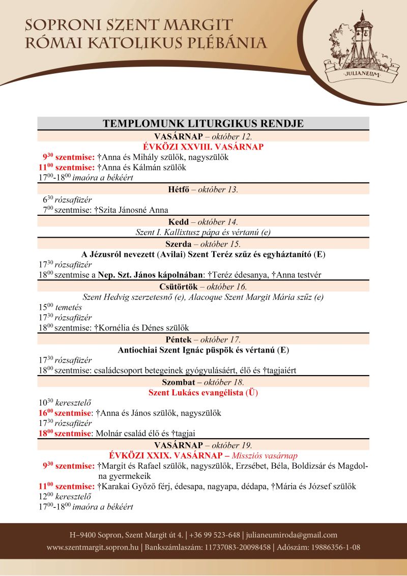 Október a rózsafüzér hónapja. A hétköznapi és a szombat esti szentmisék előtt fél órával rózsafüzér kezdődik templomunkban.