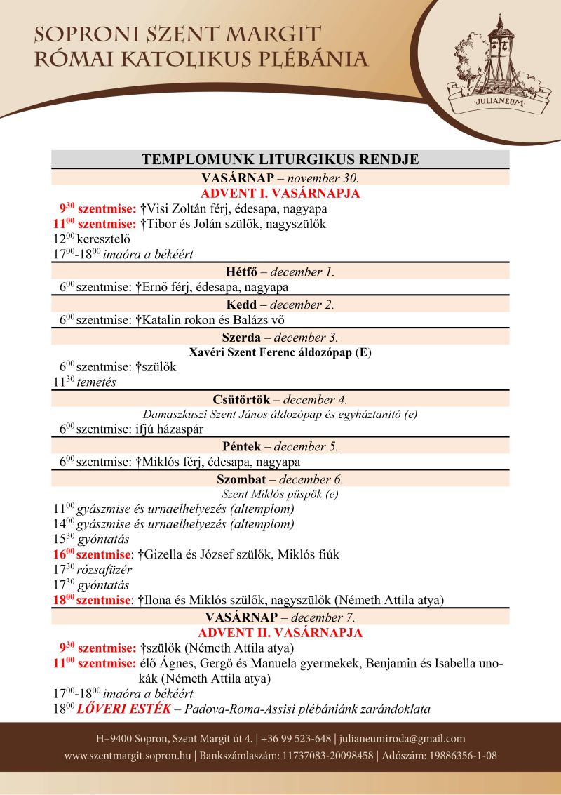 Advent szombatjain az esti szentmise elején közösségeink vezetésével végezzük a gyertyagyújtást. Jövő szombaton (december 6.) a Rózsafüzér társulatunk végzi a gyertyagyújtást.
