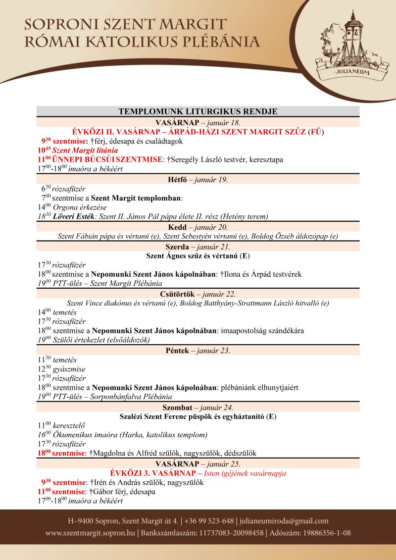 A hétfő reggeli szentmise itt, a templomban lesz, a szerdai, csütörtöki és pénteki (2026.01.21-23.) – az orgonaépítés miatt – a Nepomuki Szent János kápolnában.
