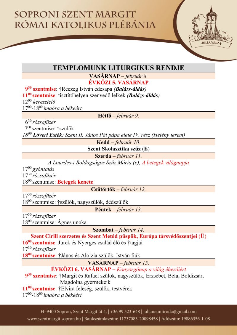 Szerdán (február 11.) a betegek világnapján, a 18 órakor kezdődő szentmisében lehetőség nyílik a betegek szentségének felvételére. Aki szeretné felvenni a betegek kenetét, kérem, jelentkezzen a sekrestyében!