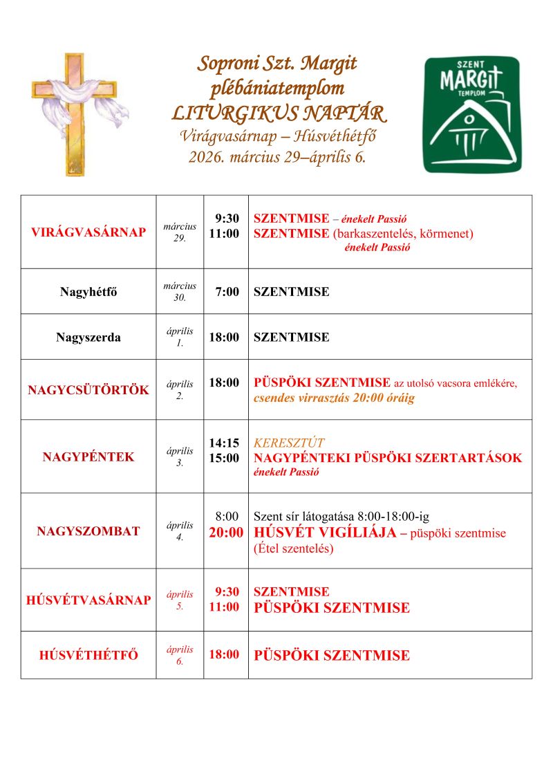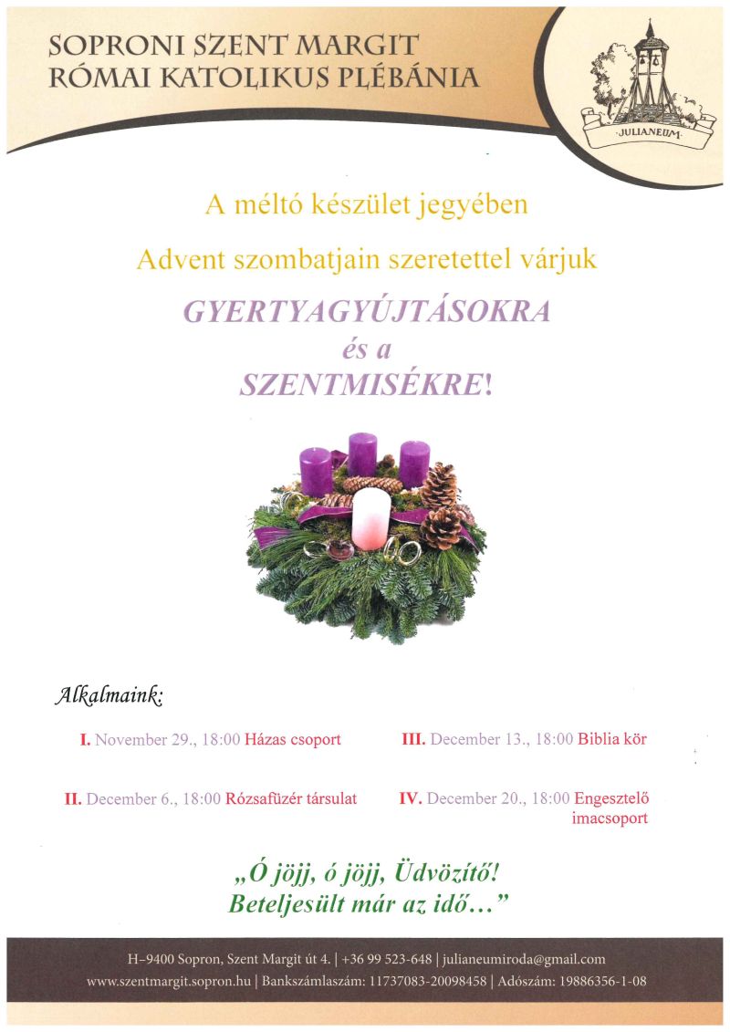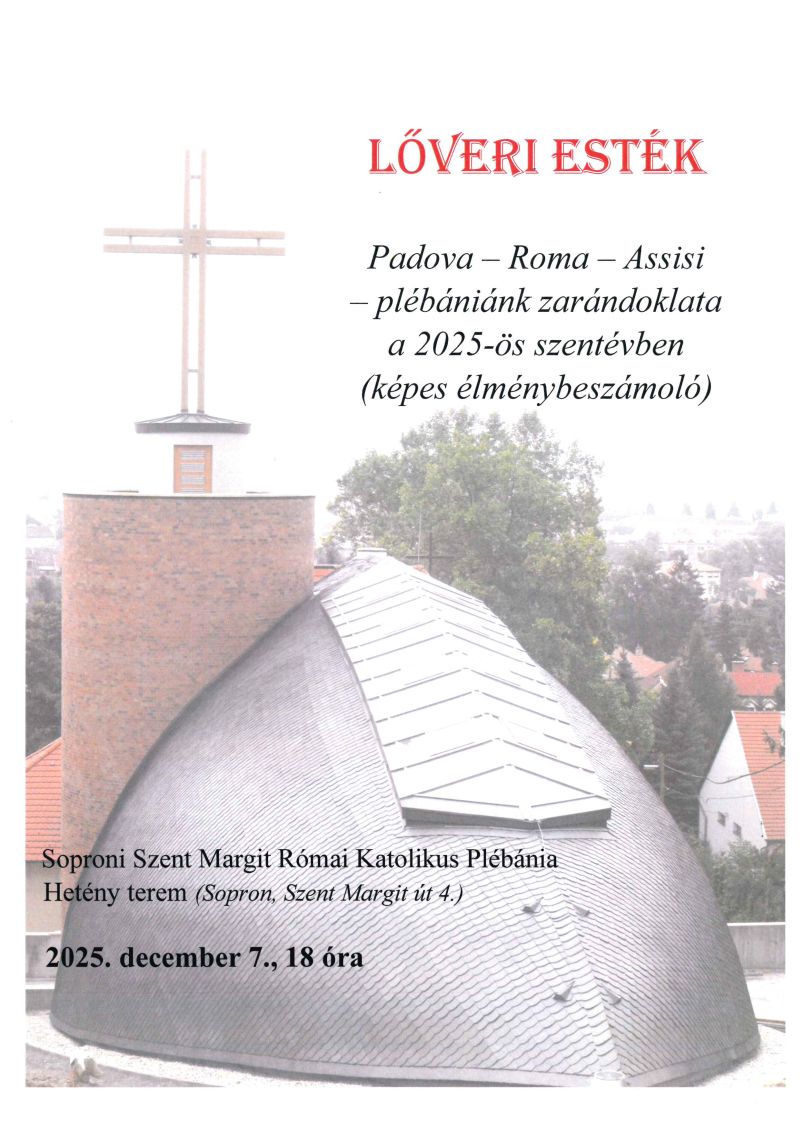 A soproni születésű Munkácsy Mihály-díjas grafikusművész, Hertay Mária Anna bibliai témájú (Sopron város tulajdonában lévő) képeiből állandó kiállítás van plébániánk Hetény termében. Szeretettel várjuk az érdeklődőket! ---- Az idei évben szeretnénk egy méltó sípos orgonát vásárolni templomunk részére, amely a liturgiában is megállja a helyét, ill. hangversenyezésre is alkalmas. Terveink szerint egy német származású, Kemper nevezetű orgonaépítő által készített hangszert szeretnénk megvásárolni. Az orgona megvásárlása és a mesterek általi átépítése, „templomunkhoz igazítása” kb. 40.000 Euro, + ÁFA. Amennyiben szívesen támogatná az orgona beszerzését, ezt megteheti banki utalással a 11737083-20098458 számlaszámra „orgona” megjelöléssel. ---- A korábban kápolnaként működő, ma Hetény János közösségi terem igénybe vehető, bérelhető családi- ill. kisebb létszámú közösségek (10-50 fő) vallási rendezvények (keresztelő, elsőáldozás, bérmálás, házasságkötés, házassági évforduló, halotti tor), születés- és névnap, előadások, összejövetelek alkalmával. Részletes tájékoztatást szívesen ad Staglné Hajtó Szilvia hivatali időben személyesen vagy telefonon. ---- Altemplomunkban urnafülkék megváltására van lehetőség. A részletekről szívesen ad felvilágosítást Szilvia a plébánia irodájában. ---- |