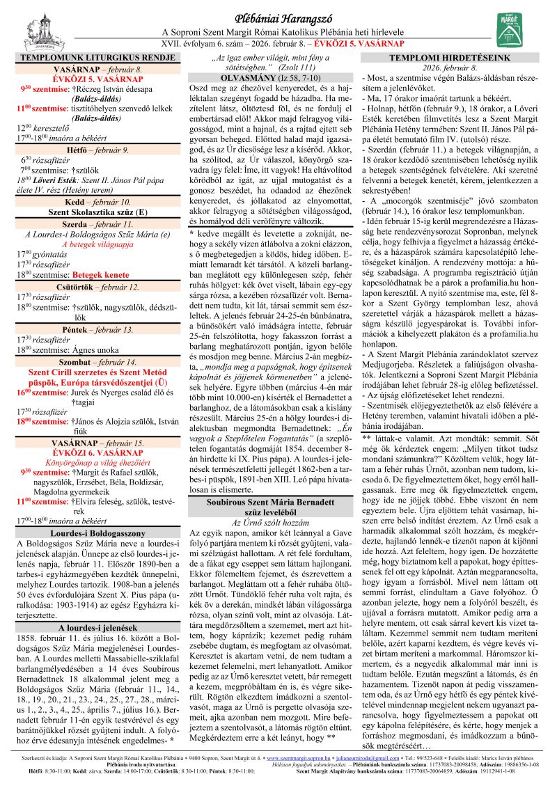 Szerdán (február 11.) a betegek világnapján, a 18 órakor kezdődő szentmisében lehetőség nyílik a betegek szentségének felvételére. Aki szeretné felvenni a betegek kenetét, kérem, jelentkezzen a sekrestyében!