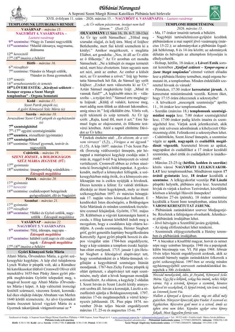 Március 23-25-ig (hétfőn, kedden és szerdán) közös városi NAGYBÖJTI LELKIGYAKORLAT lesz templomunkban. Szeretettel hívjuk és várjuk a kedves Testvéreket, készüljünk közösen a közelgő Húsvéti ünnepekre!