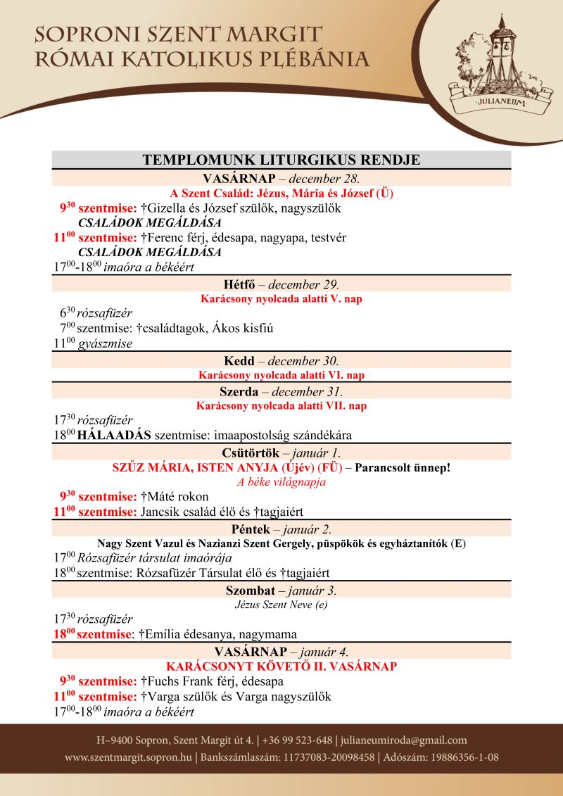 Csütörtökön (január 1.), Szűz Mária, Isten Anyja parancsolt főünnepén, újesztendő első napján 9:30 és 11:00 órakor kezdődnek a szentmisék.