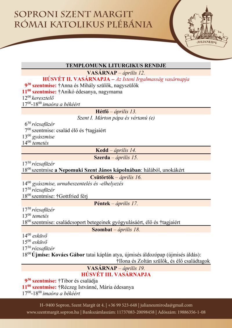 Jövő szombaton (április 18.), 18 órakor Kovács Gábor tatai káplán atya mutat be újmisét templomunkban. Az újmisén való részvétellel teljes búcsú nyerhető.
